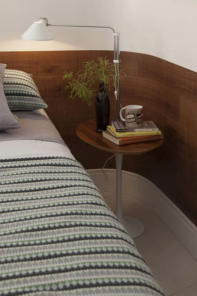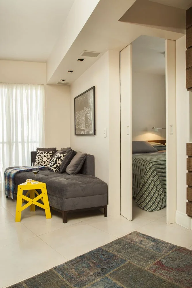 No apartamento de 37m2 o pequeno dormitório não permitia uma cama queen size mais um armário. A solução foi levar o armário para o hall de entrada com um jeito de painel de madeira. No mesmo hall foram acomodados discos e instrumentos musicais. O sofá precisou ser desenhado com formato que não atrapalhasse a circulação. A cozinha fica meio escondida atrás do painel de TV.